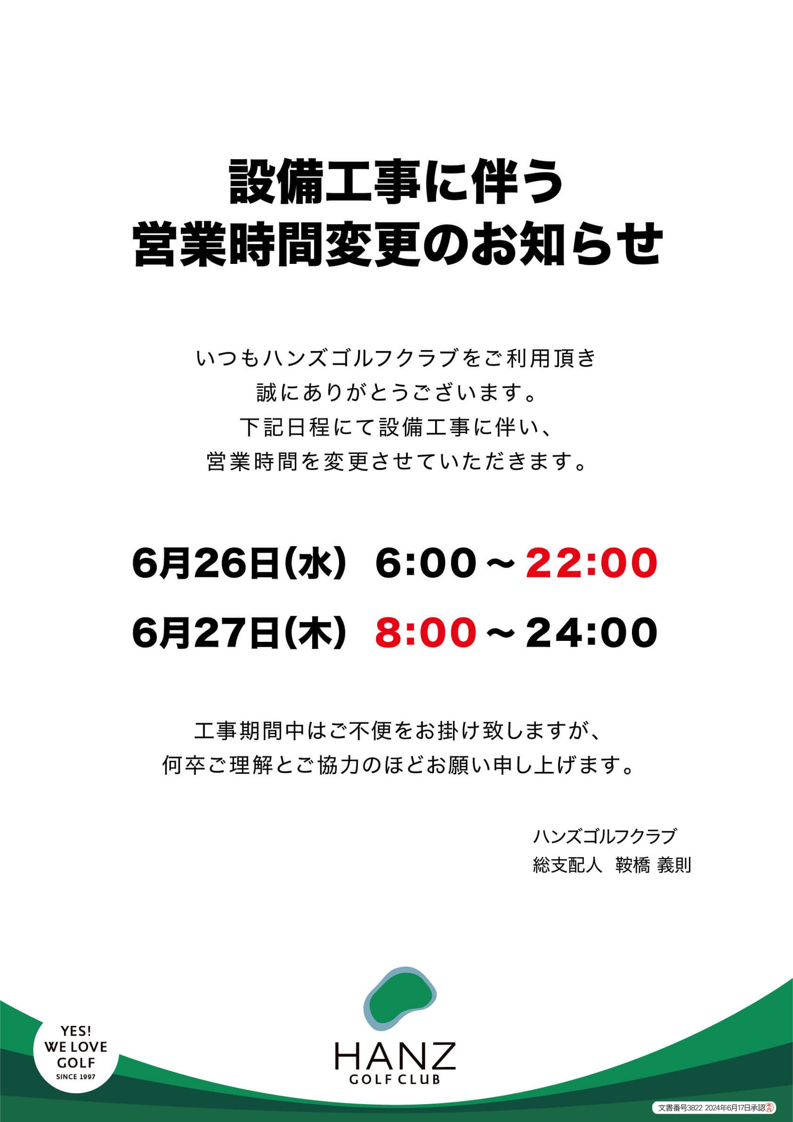 6/26(水)・6/27(木)設備工事に伴う営業時間変更のお知らせ